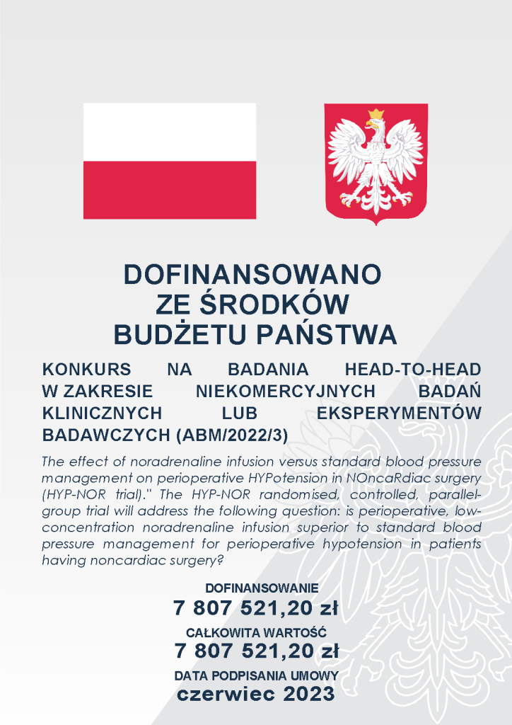 | Tytuł projektu | „The effect of noradrenaline infusion versus standard blood pressure management on perioperative HYPotension in NOncaRdiac surgery (HYP-NOR trial).” The HYP-NOR randomised, controlled, parallel-group trial will address the following question: is perioperative, low-concentration noradrenaline infusion superior to standard blood pressure management for perioperative hypotension in patients having noncardiac surgery? |